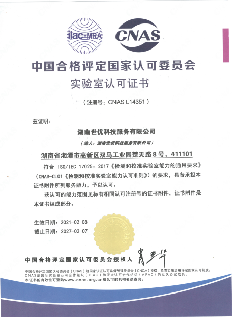 2020年9月,世優(yōu)科服已順利取得了由湖南省市場(chǎng)監(jiān)督管理局頒發(fā)的檢驗(yàn)檢測(cè)機(jī)構(gòu)資質(zhì)認(rèn)定證書(shū)(證書(shū)編號(hào)201821342039),標(biāo)志著公司在技術(shù)能力和質(zhì)量管理方面都達(dá)到RB/T214-2017《檢驗(yàn)檢測(cè)機(jī)構(gòu)資質(zhì)認(rèn)定能力評(píng)價(jià)檢驗(yàn)檢測(cè)機(jī)構(gòu)通用要求》的要求。